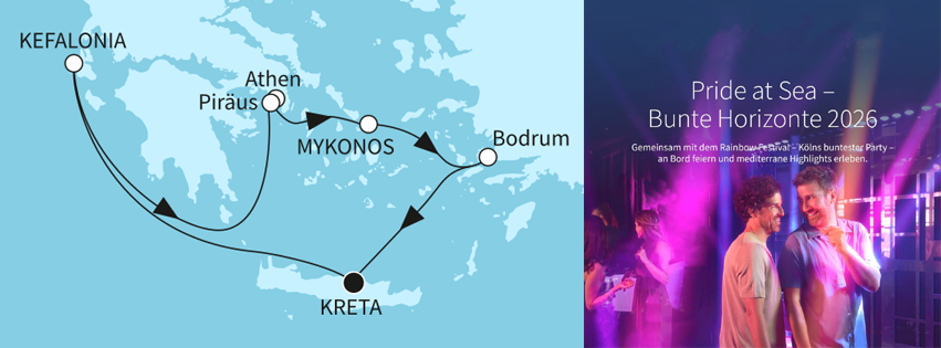 Als eines der Highlights stoppen wir am 17.06.2026 auf Mykonos, die Insel die für die tolle Gay-Szene sowie die atemberaubende Schönheit der Strände bekannt ist. Die unvergessliche Reise durch das östliche Mittelmeer führt des Weiteren nach Piräus, der lebendigen Hafenstadt vor den Toren Athens, ins malerische Argostoli, der Hauptstadt der Insel Kefalonia sowie ins quirlige Bodrum, dem türkischen Juwel mit seiner herzlichen Gastfreundschaft.